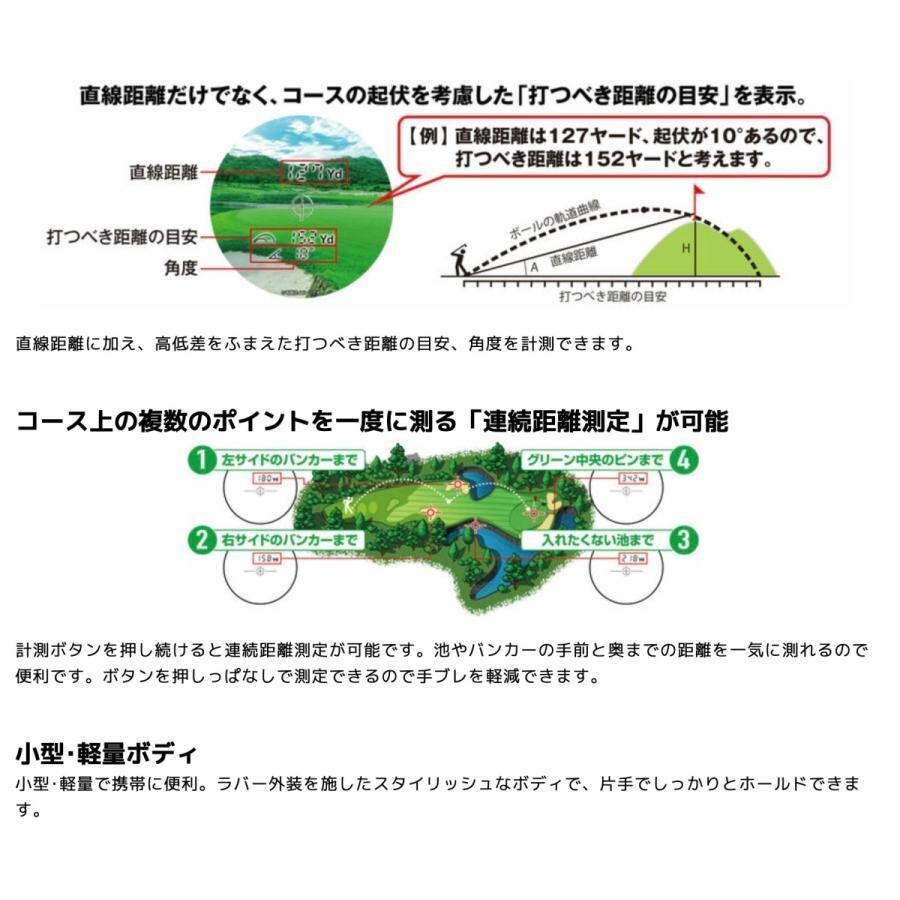 計測ボタンを押し続けると連続距離測定が可能です。池やバンカーの手前と奥までの距離を一気に測れるので便利です。ボタンを押しっぱなしで測定できるので手ブレを軽減できます。