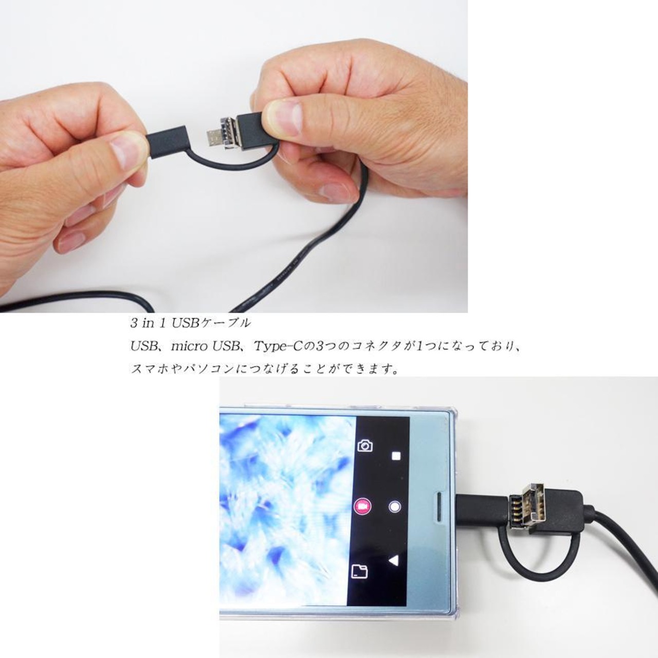 USB、micro USB、Type-Cの3つのコネクタが1つになっており、 スマホやパソコンにつなげることができます。